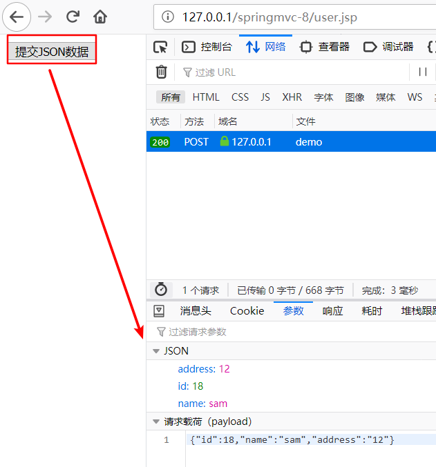注意: 1.需要导入jquery.min.js包 2.需要配置静态资源放行 <%@ page language="java" contentType="text/html; charset=UTF-8" pageEncoding="UTF-8"%> <html> <head> <meta http-equiv="Content-Type" content="text/html; charset=UTF-8"> <title>Insert title here</title> <script type="text/javascript" src="js/jquery.min.js"></script> </head> <body> <input type="button" value="提交JSON数据" onclick="demo();"> <script type="text/javascript"> function demo(){ $.ajax({ type: 'POST', url: "demo", contentType: "application/json",//如果想以json格式把数据提交到后台的话,这个必须有,否则只会当做表单提交 data: JSON.stringify({"id":18,"name":"sam","address":"12"}),//JSON.stringify()必须有,否则只会当做表单的格式提交 dataType: "json",//期待返回的数据类型 success: function(data){ alert("success:"+data); }, error:function(data){ alert("error"+data); } }); } </script> </body> </html>