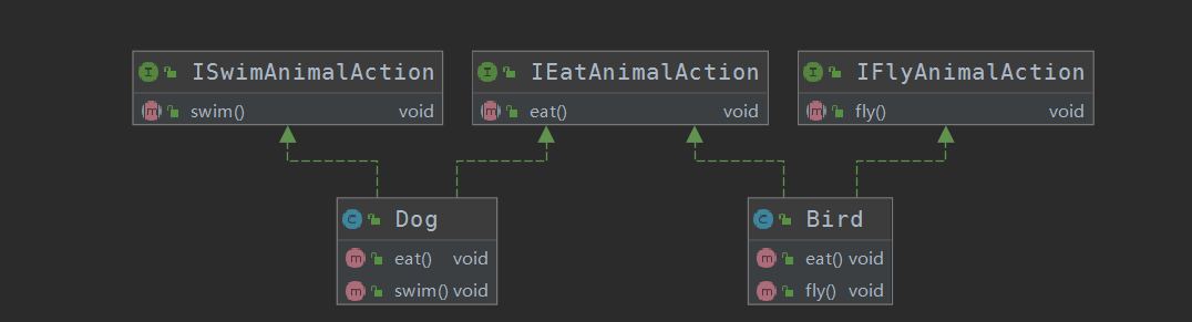 - 定义: 用多个专门的接口,而不使用单一的总接口,客户端不应该依赖他不需要的接口