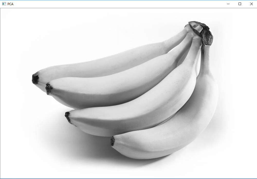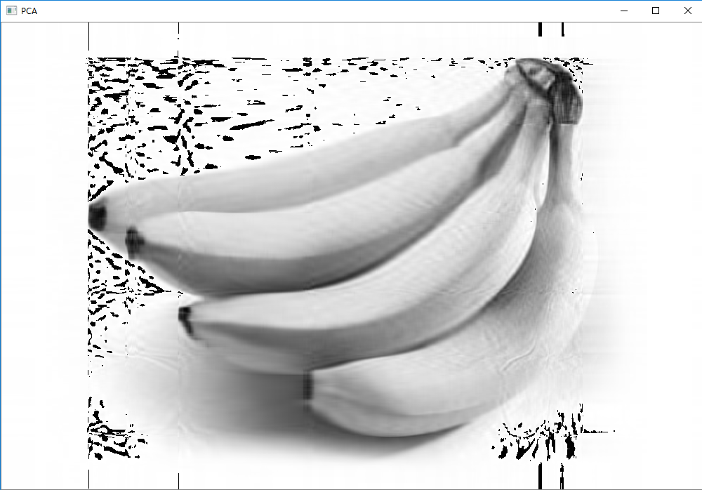 #encoding:GBK """ Created on 2019/09/23 16:19:11 @author: Sirius_xuan """ ''' 基于PCA的图像降维及重构 ''' import numpy as np import cv2 as cv #数据中心化 def Z_centered(dataMat): rows,cols=dataMat.shape meanVal = np.mean(dataMat, axis=0) # 按列求均值,即求各个特征的均值 meanVal = np.tile(meanVal,(rows,1)) newdata = dataMat-meanVal return newdata, meanVal #协方差矩阵 def Cov(dataMat): meanVal = np.mean(data,0) #压缩行,返回1*cols矩阵,对各列求均值 meanVal = np.tile(meanVal, (rows,1)) #返回rows行的均值矩阵 Z = dataMat - meanVal Zcov = (1/(rows-1))*Z.T * Z return Zcov #最小化降维造成的损失,确定k def Percentage2n(eigVals, percentage): sortArray = np.sort(eigVals) # 升序 sortArray = sortArray[-1::-1] # 逆转,即降序 arraySum = sum(sortArray) tmpSum = 0 num = 0 for i in sortArray: tmpSum += i num += 1 if tmpSum >= arraySum * percentage: return num #得到最大的k个特征值和特征向量 def EigDV(covMat, p): D, V = np.linalg.eig(covMat) # 得到特征值和特征向量 k = Percentage2n(D, p) # 确定k值 print("保留99%信息,降维后的特征个数:"+str(k)+"\n") eigenvalue = np.argsort(D) K_eigenValue = eigenvalue[-1:-(k+1):-1] K_eigenVector = V[:,K_eigenValue] return K_eigenValue, K_eigenVector #得到降维后的数据 def getlowDataMat(DataMat, K_eigenVector): return DataMat * K_eigenVector #重构数据 def Reconstruction(lowDataMat, K_eigenVector, meanVal): reconDataMat = lowDataMat * K_eigenVector.T + meanVal return reconDataMat #PCA算法 def PCA(data, p): dataMat = np.float32(np.mat(data)) #数据中心化 dataMat, meanVal = Z_centered(dataMat) #计算协方差矩阵 #covMat = Cov(dataMat) covMat = np.cov(dataMat, rowvar=0) #得到最大的k个特征值和特征向量 D, V = EigDV(covMat, p) #得到降维后的数据 lowDataMat = getlowDataMat(dataMat, V) #重构数据 reconDataMat = Reconstruction(lowDataMat, V, meanVal) return reconDataMat def main(): imagePath = 'D:/desktop/banana.jpg' image = cv.imread(imagePath) image=cv.cvtColor(image,cv.COLOR_BGR2GRAY) rows,cols=image.shape print("降维前的特征个数:"+str(cols)+"\n") print(image) print('----------------------------------------') reconImage = PCA(image, 0.99) reconImage = reconImage.astype(np.uint8) print(reconImage) cv.imshow('test',reconImage) cv.waitKey(0) cv.destroyAllWindows() if __name__=='__main__': main() 4 结果