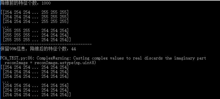 不难发现,在保留99%信息的情况下,维度由1000降到了44,这大大减小了图像分类时的计算量,重构前和重构后的特征依然明显,读者也可自行调整percentage参数,体验PCA的效果。