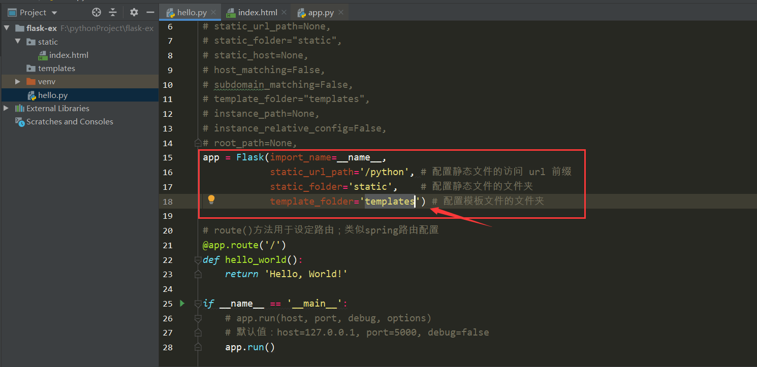 # 实例化app,参数如下: # import_name, # static_url_path=None, # static_folder="static", # static_host=None, # host_matching=False, # subdomain_matching=False, # template_folder="templates", # instance_path=None, # instance_relative_config=False, # root_path=None, app = Flask(import_name=__name__, static_url_path='/python', # 配置静态文件的访问 url 前缀 static_folder='static', # 配置静态文件的文件夹 template_folder='templates') # 配置模板文件的文件夹 配置示例