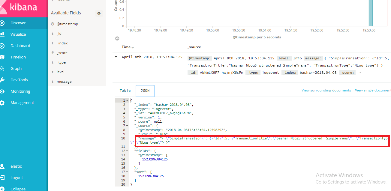 var _simpleObj = new MySimpleClass(5, "my structured Simple obj", "Sometype"); var logger = LogManager.GetLogger("Example"); logger.Info("{@MySimpleClass}", _simpleObj ); While When I log/store the same Structured data by using SeriLog, I can do query because I have the fields of object out of the message scope and as fields, please look to below image: