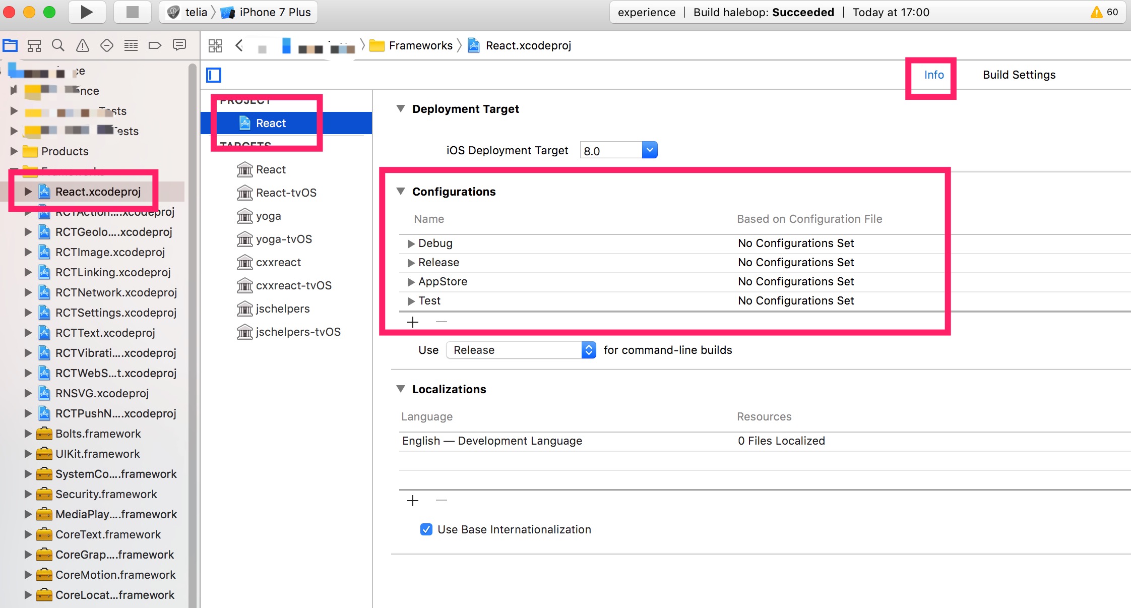 For example, if you have "Debug/Release/Test/AppStore" 4 configurations in your own project, you have to make sure React.xcodeproj also has the same 4 configurations.