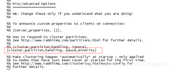 - 修改/etc/rabbitmq/rabbitmq.config配置文件,添加pause_minority策略;