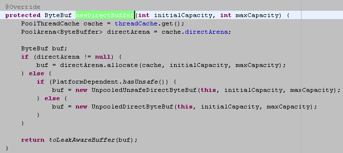 我们重点分析newByteBuf的实现,它同样是个抽象方法,由子类DirectArena和HeapArena来实现不同类型的缓冲区分配,由于测试用例使用的是堆外内存,