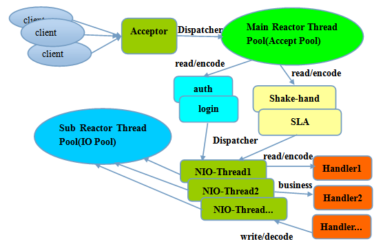 主从Reactor线程模型的特点是:服务端用于接收客户端连接的不再是个1个单独的NIO线程,而是一个独立的NIO线程池。Acceptor接收到客户端TCP连接请求处理完成后(可能包含接入认证等),将新创建的SocketChannel注册到IO线程池(sub reactor线程池)的某个IO线程上,由它负责SocketChannel的读写和编解码工作。Acceptor线程池仅仅只用于客户端的登陆、握手和安全认证,一旦链路建立成功,就将链路注册到后端subReactor线程池的IO线程上,由IO线程负责后续的IO操作。