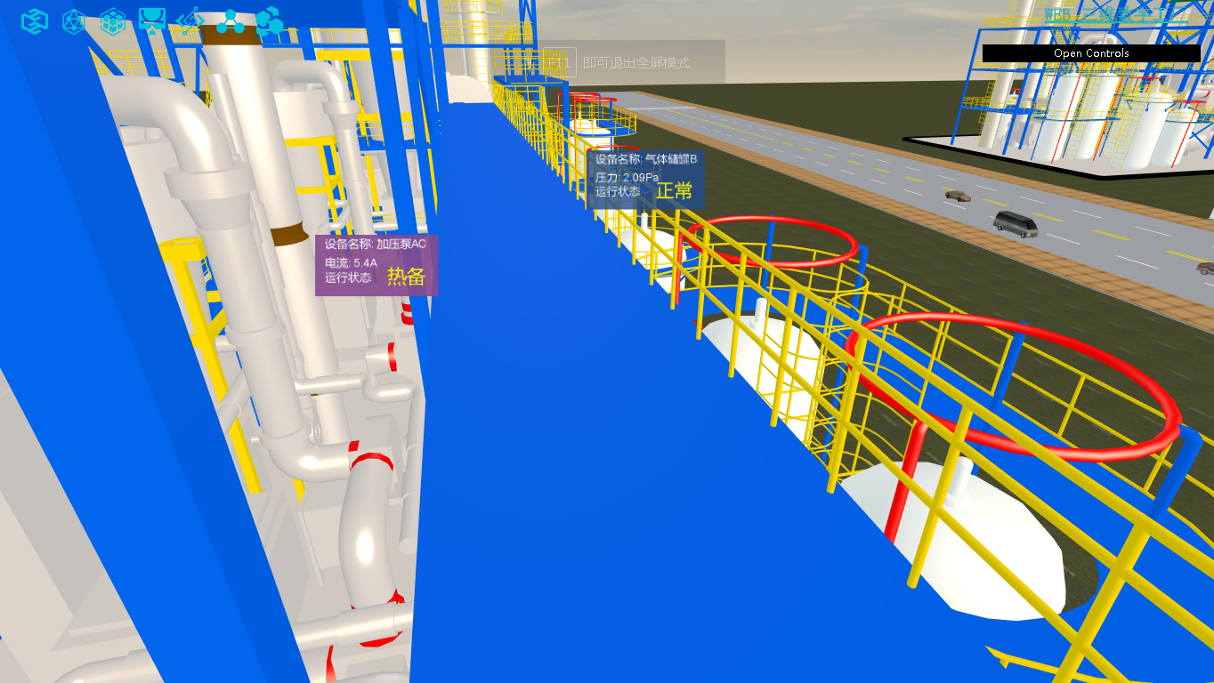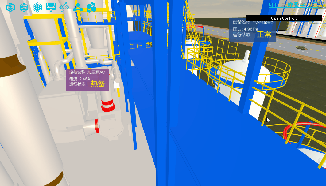 对工厂、园区的罐体(油罐、气体罐等)进行实时监控和动态模拟,仿真罐体的液位、流向,达到可视化监测监控及模拟演练效果。