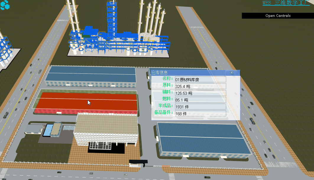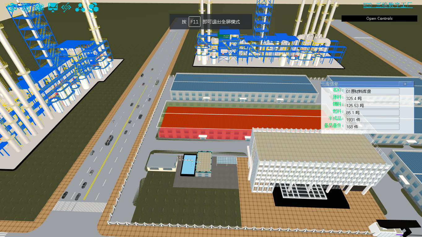 原材料、产量、设备资产三维可视化统计,查看工厂或仓库设备设施、统计信息图形图表查看。