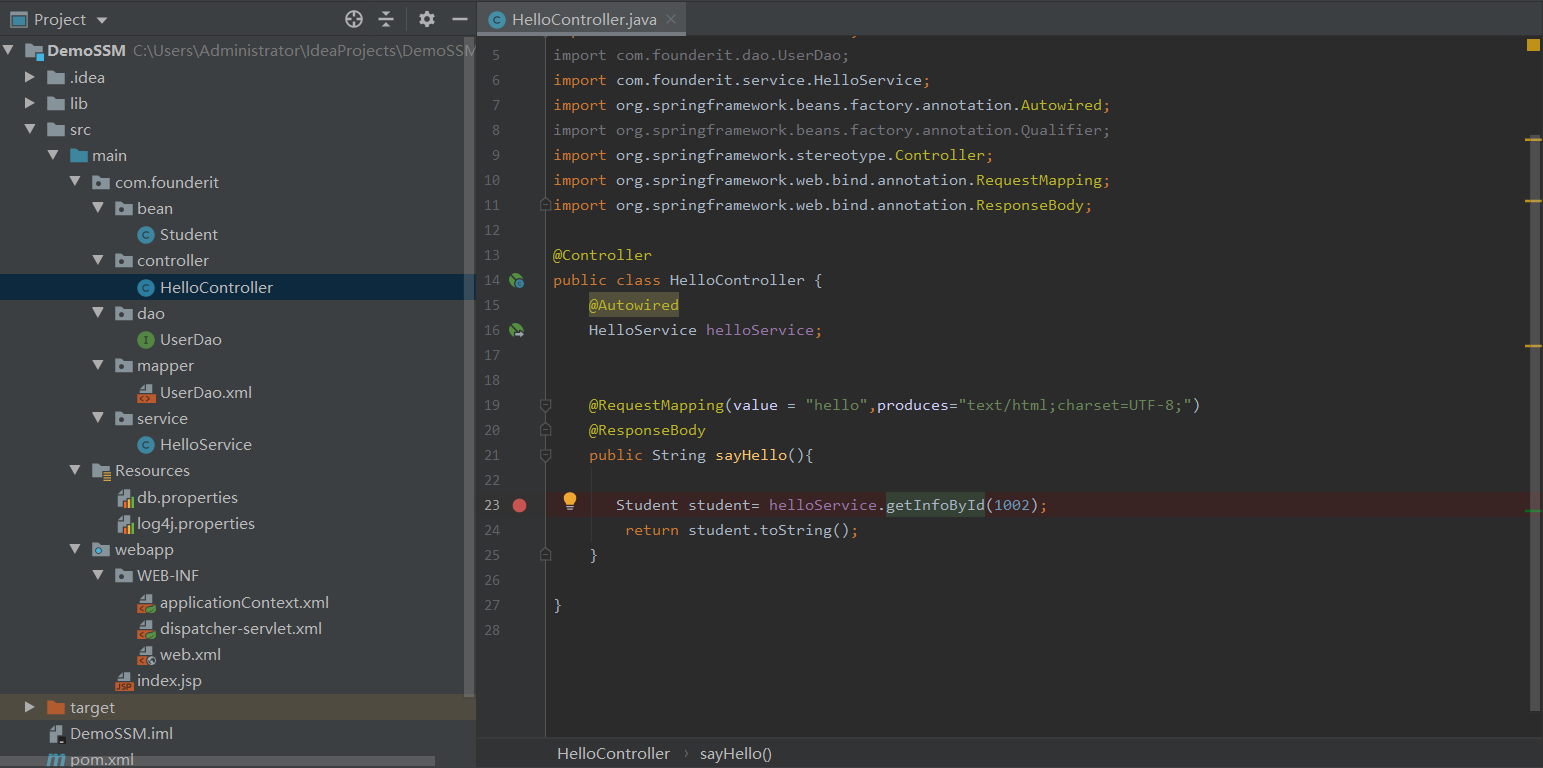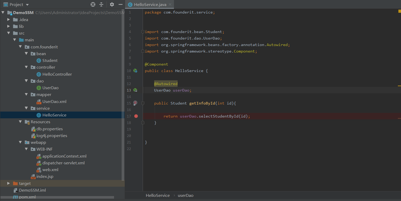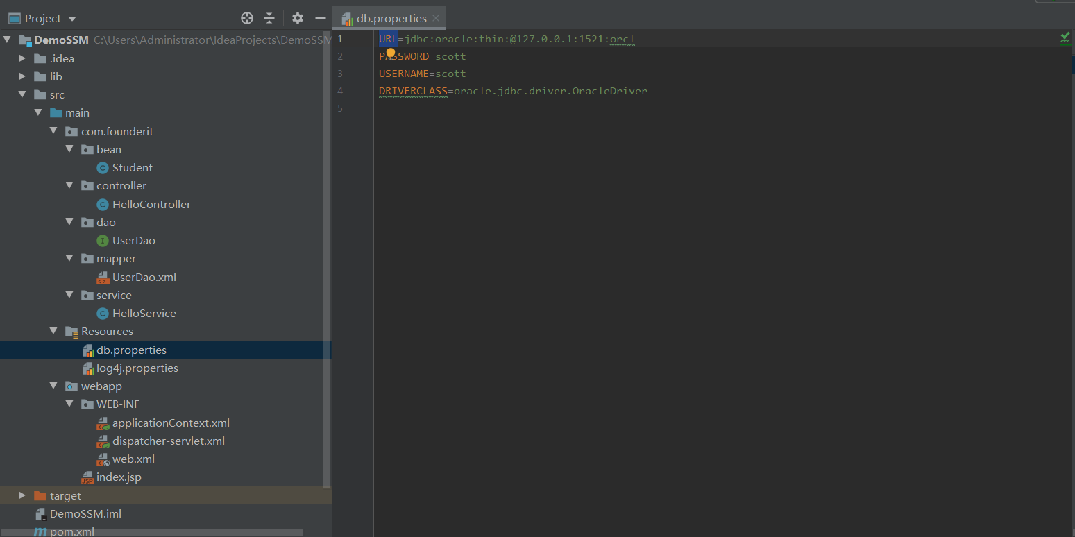 <?xml version="1.0" encoding="UTF-8"?><beans xmlns="http://www.springframework.org/schema/beans" xmlns:xsi="http://www.w3.org/2001/XMLSchema-instance" xmlns:mvc="http://www.springframework.org/schema/mvc" xmlns:context="http://www.springframework.org/schema/context" xmlns:tx="http://www.springframework.org/schema/tx" xmlns:aop="http://www.springframework.org/schema/aop" xsi:schemaLocation="http://www.springframework.org/schema/beans http://www.springframework.org/schema/beans/spring-beans.xsd http://www.springframework.org/schema/tx http://www.springframework.org/schema/tx/spring-tx.xsd http://www.springframework.org/schema/aop https://www.springframework.org/schema/aop/spring-aop.xsd http://www.springframework.org/schema/context http://www.springframework.org/schema/context/spring-context-3.0.xsd http://www.springframework.org/schema/mvc http://www.springframework.org/schema/mvc/spring-mvc-3.0.xsd"> <mvc:annotation-driven/> <mvc:default-servlet-handler/> <!--开启扫描--> <context:component-scan base-package="com.founderit"/> <context:annotation-config/> <context:property-placeholder location="classpath:Resources/db.properties"/> <!--DBCP数据库连接池--> <bean id="dataSource" class="org.apache.commons.dbcp2.BasicDataSource" destroy-method="close"> <property name="driverClassName" value="${DRIVERCLASS}"/> <property name="url" value="${URL}"/> <property name="username" value="${USERNAME}"/> <property name="password" value="${PASSWORD}"/> <!--maxActive: 最大连接数量--> <property name="maxTotal" value="150"/> <!--minIdle: 最小空闲连接--> <property name="minIdle" value="5"/> <!--maxIdle: 最大空闲连接--> <property name="maxIdle" value="20"/> <!--initialSize: 初始化连接--> <property name="initialSize" value="30"/> <!--removeAbandonedTimeout: 超时时间(以秒数为单位)--> <property name="removeAbandonedTimeout" value="10"/> </bean> <!-- spring和MyBatis完美整合 --> <bean id="sqlSessionFactory" class="org.mybatis.spring.SqlSessionFactoryBean"> <property name="dataSource" ref="dataSource"/> <!-- 自动扫描mapping.xml文件 --> <property name="mapperLocations" value="classpath:com/founderit/mapper/*.xml"></property> </bean> <!-- DAO接口所在包名,Spring会自动查找其下的类 --> <bean class="org.mybatis.spring.mapper.MapperScannerConfigurer"> <property name="basePackage" value="com.founderit.dao"/> <!-- <property name="sqlSessionFactoryBeanName" value="sqlSessionFactory"></property>--> </bean> <!-- (事务管理)transaction manager --> <bean id="transactionManager" class="org.springframework.jdbc.datasource.DataSourceTransactionManager"> <property name="dataSource" ref="dataSource"/> </bean> <!-- 通知 --> <tx:advice id="txAdvice" transaction-manager="transactionManager"> <tx:attributes> <!-- 传播行为 --> <tx:method name="save*" propagation="REQUIRED" /> <tx:method name="insert*" propagation="REQUIRED" /> <tx:method name="add*" propagation="REQUIRED" /> <tx:method name="create*" propagation="REQUIRED" /> <tx:method name="delete*" propagation="REQUIRED" /> <tx:method name="update*" propagation="REQUIRED" /> <tx:method name="find*" propagation="SUPPORTS" read-only="true" /> <tx:method name="select*" propagation="SUPPORTS" read-only="true" /> <tx:method name="get*" propagation="SUPPORTS" read-only="true" /> </tx:attributes> </tx:advice> <!-- 切面 --> <aop:config> <aop:advisor advice-ref="txAdvice" pointcut="execution(* com.founderit.service.*.*(..))" /> </aop:config></beans>按完整项目,建立对应的类