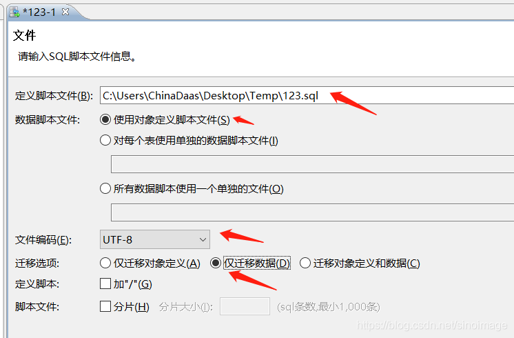 3、定义输出文件,本次仅导出数据,即Insert into 语句