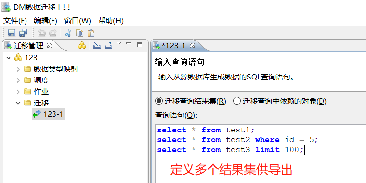4、选择使用查询语句做为数据来源,可以非常灵活的定义需要导出的数据内容,相较于其他数据库自带的导出工具,DM的显得更加灵活。
