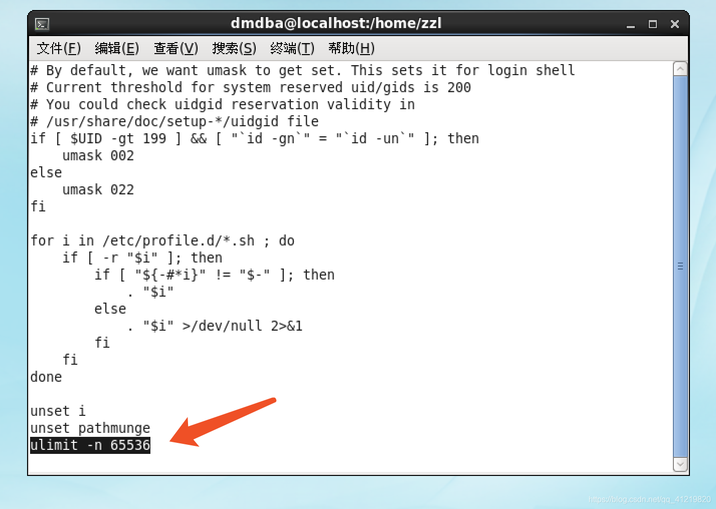 在最后新增一行:ulimit -n 65536 保存并退出,最好是重启一下服务器,这样才能生效。