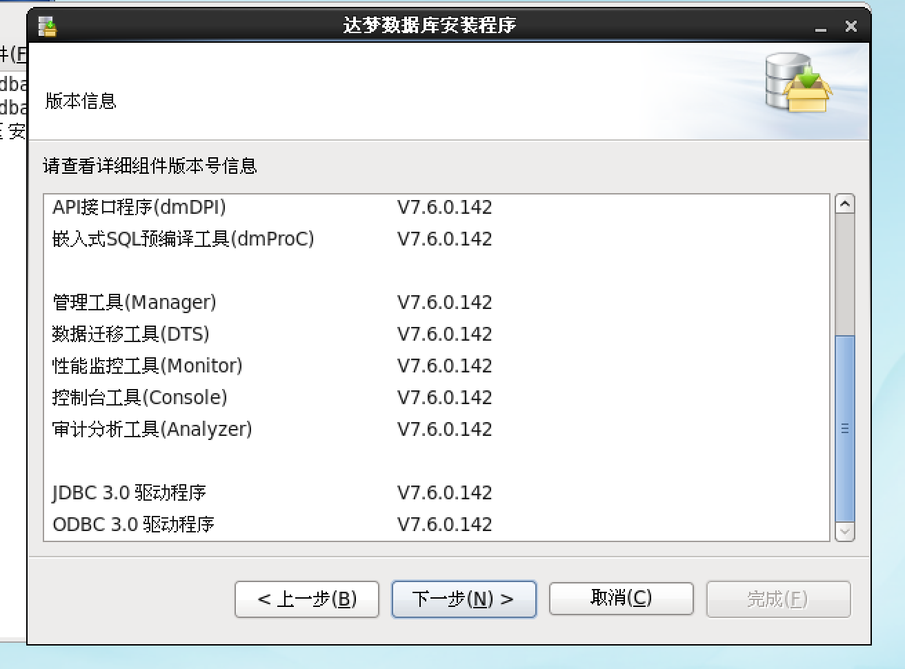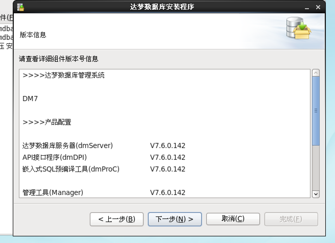 安装程序中介绍了DM7安装的组件与版本号信息,点击下一步