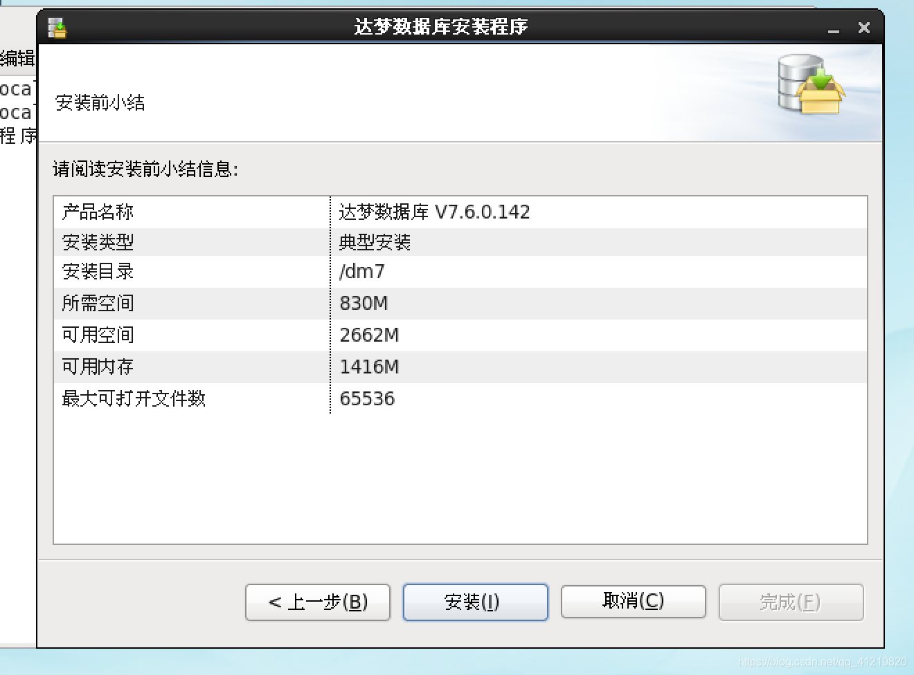 在安装前做最后一次确认,显示服务器可用空间、内存、最大可打开文件数等,确认无误后,点击安装