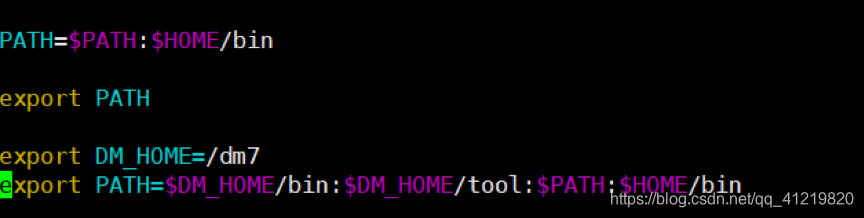 在.bash_profile文件中写入:export DM_HOME="/dm7"和export PATH=$DM_HOME/bin:$DM_HOME/tool:$PATH:$HOME/bin并保存退出