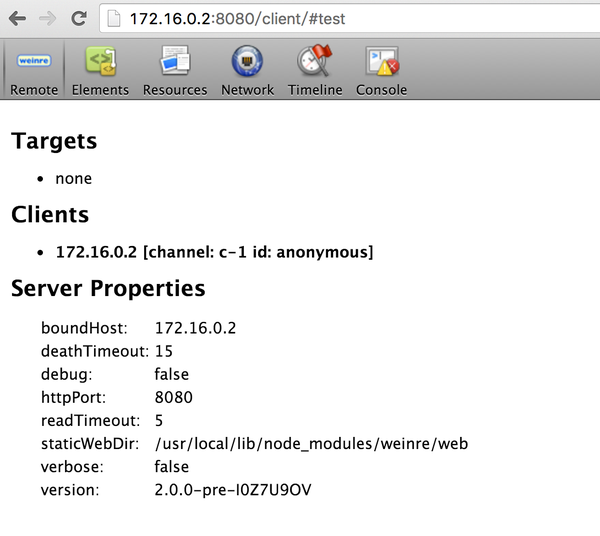 小提示:这个 JS 后面的 #anonymous 起到一个标识作用,为了区别,我们可以将其修改成 #test 放到页面中。这时候,我们的 Inspect 面板的地址就不是 http://172.16.0.2:8080/client/#anonymous 了,而是 http://172.16.0.2:8080/client/#test 。
