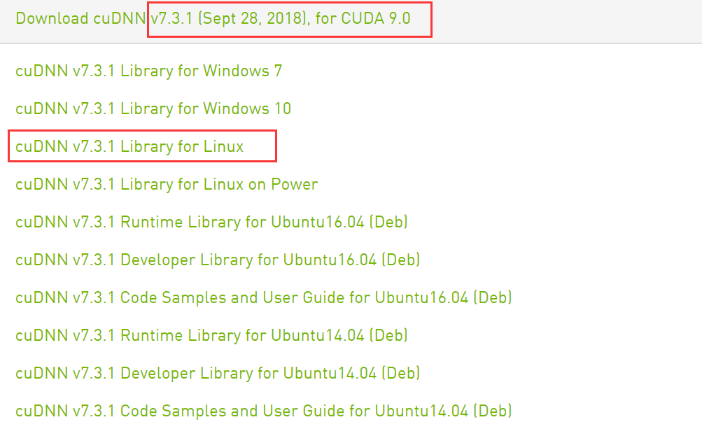 去官网下载需要的cudnn,注意要与自己的cuda版本以及平台相对应,我这里下载的是linux平台的对应cuda9.0的7.3.1版本的cudnn