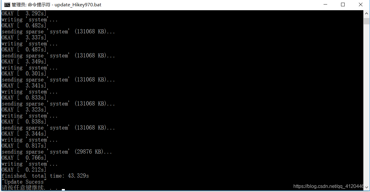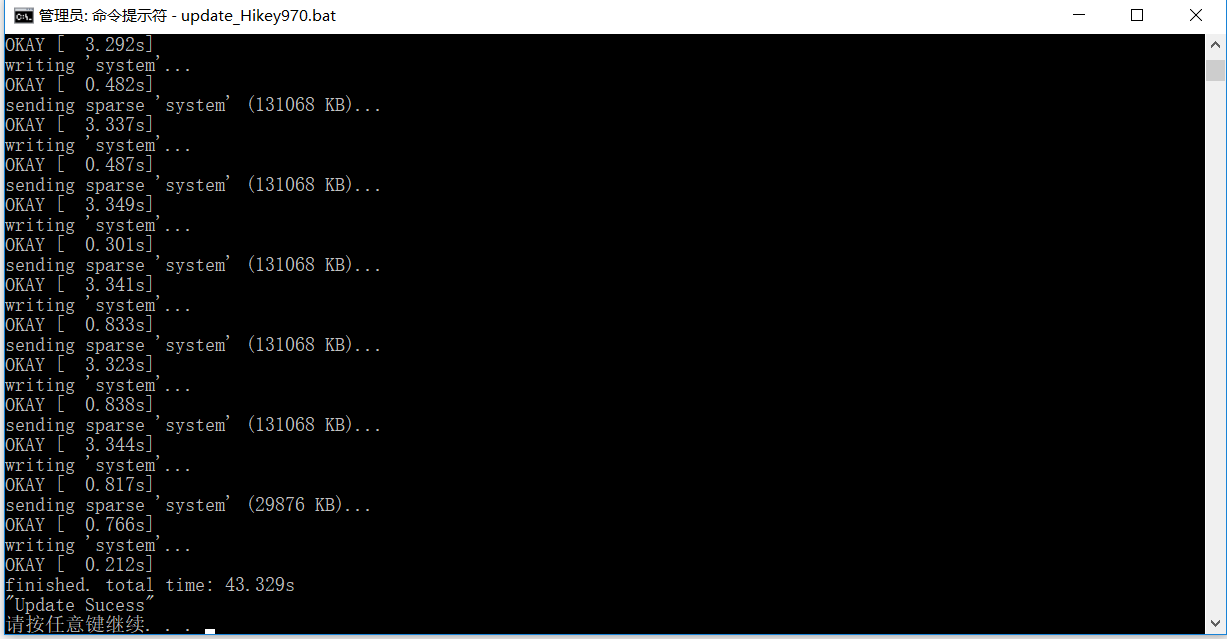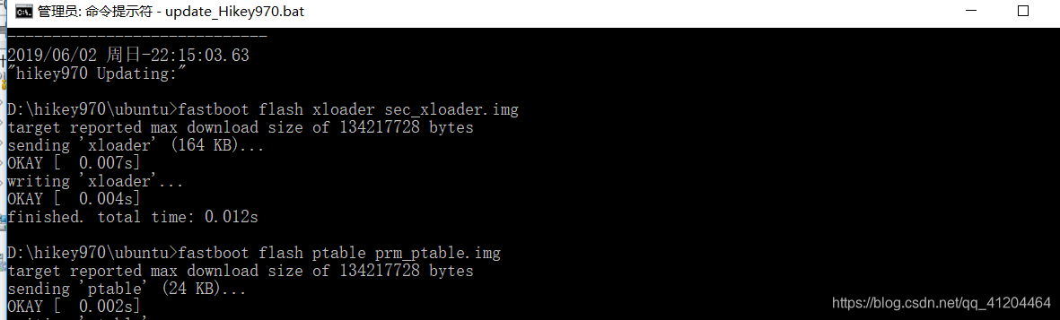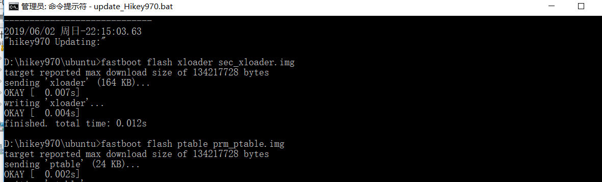 3) 在PC CMD命令行中输入:update_Hikey970.bat 回车