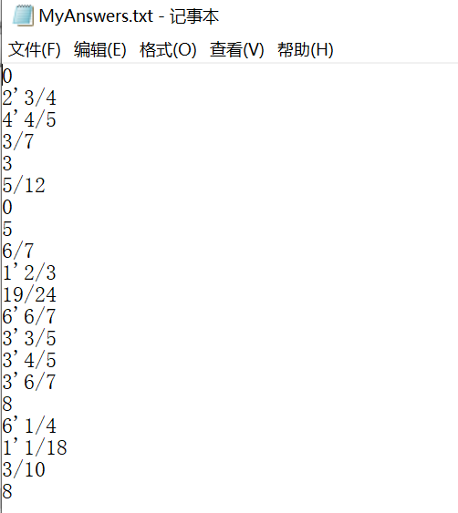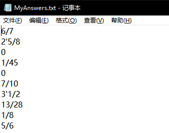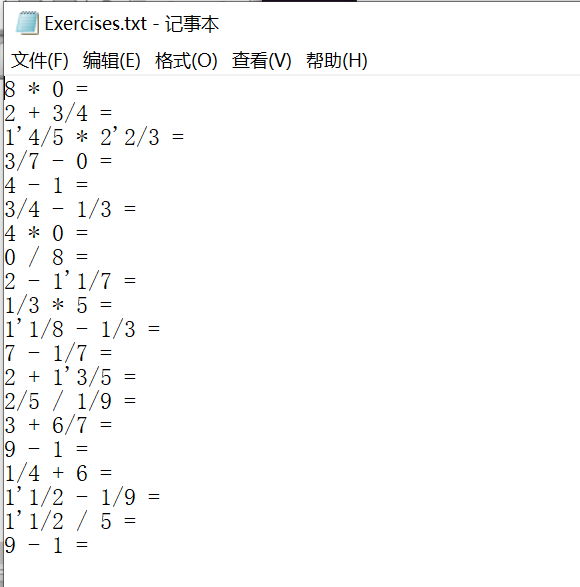 生成的题目存入执行程序的当前目录下的Exercises.txt文件,格式如下:
