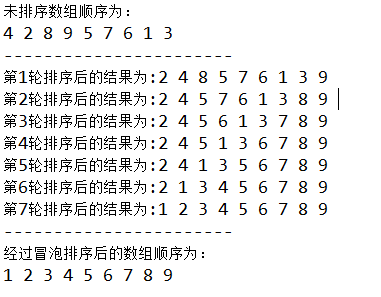 本来应该是 8 轮排序的,这里我们只进行了 7 轮排序,因为第 7 轮排序之后已经是有序数组了。