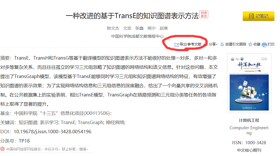 在知网中搜索到所需的文献,选择“导出参考文献”,如下图所示: