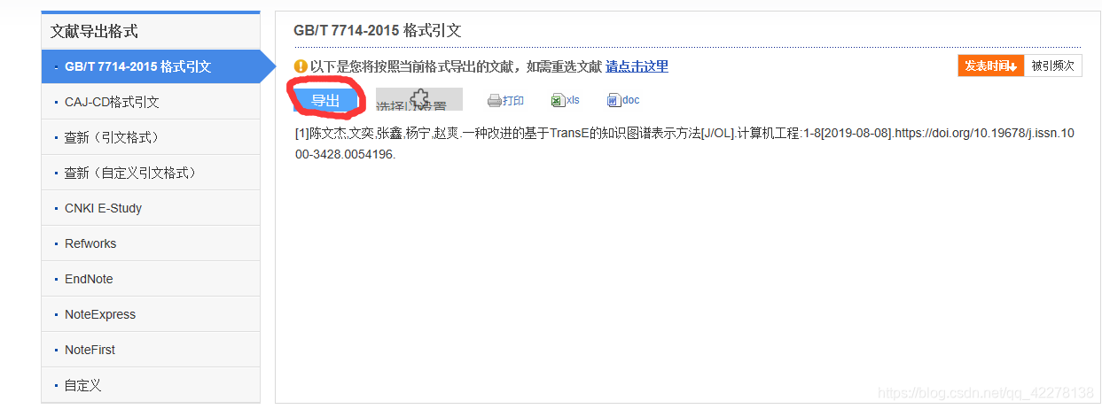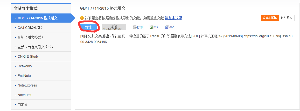 选择要导出的参考文献格式,常用的是GB/T 7714-2015,如下图所示,选择“导出”。