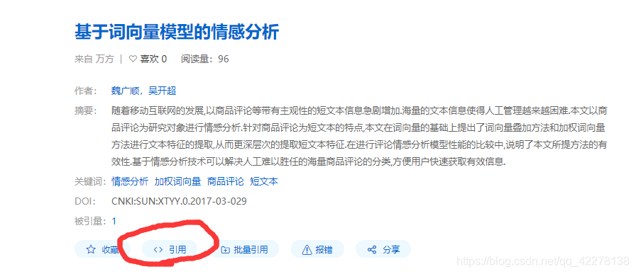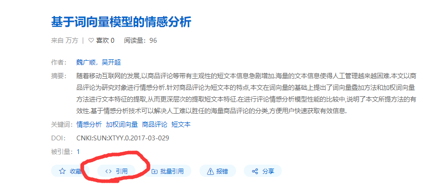 在百度学术中搜索目标文献,进入文献条目,选择“引用”,如下图所示: