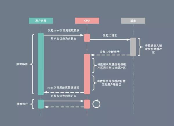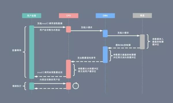 每次用户进程读取磁盘数据时,都需要 CPU 中断,然后发起 I/O 请求等待数据读取和拷贝完成,每次的 I/O 中断都导致 CPU 的上下文切换: