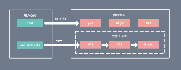 当用户进程通过 cat 命令查看主机配置时,它会对内核的文件子系统发起系统调用: