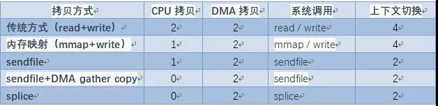 包括内存映射 mmap、Sendfile、Sendfile+DMA gather copy 以及 Splice 几种机制,并从系统调用和拷贝次数层面对它们进行了对比。