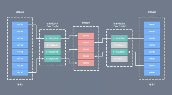 每个用户进程维护了一个单独的页表(Page Table),虚拟内存和物理内存就是通过这个页表实现地址空间的映射的。