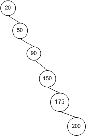 因为当在 BST 中查找一个节点时,每一步比较操作后都会将节点的数量减少一半。尽管如此,如果拓扑结构像下图中的样子时,运行时间就会退减到线性时间 O(n)。因为每一步比较操作后还是需要逐个比较其余的节点,