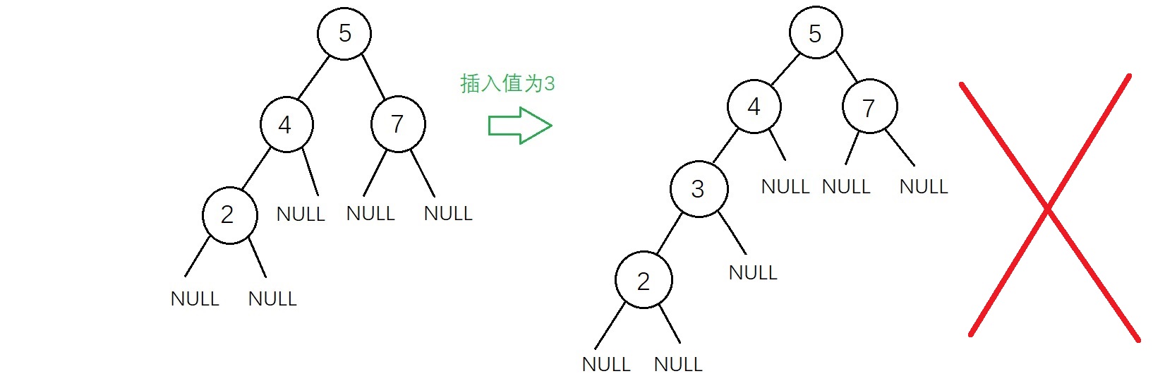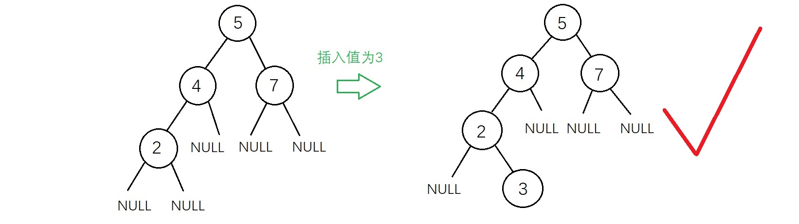 虽然上面两种插入结果得到的二叉树都符合二叉查找树的性质,但是不满足“新插入的结点一定是一个新添加的叶子结点”,因为有了这个特点插入的操作变得相对简单,实现代码如下