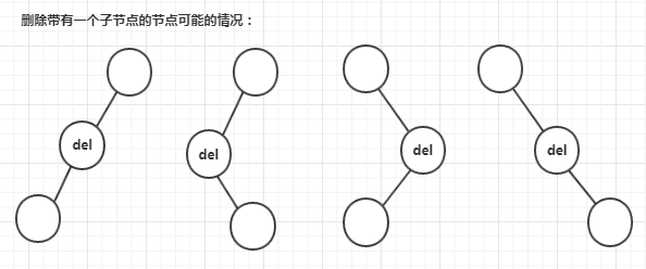 上图写了四种,但对待删除节点来说只有两种,只有左子树,或只有右子树,两种情况的处理方式基本相同,都是将待删除节点的左/右子树 赋值给 待删除节点的父节点的左/右子树