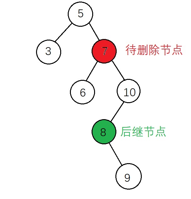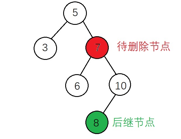 在后继节点为待删除节点的子节点的前提下,该后继节点有右子树和没有右子树的操作是相同的,都是将 后继节点 替代 待删除节点,并将待删除节点的左子树 赋值给 后继节点的左子树