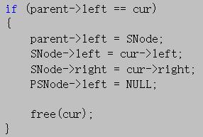 1 else if (cur->right != SNode && SNode->right == NULL) //后继节点不为待删除节点的右子树,并且该后继节点没有右子树