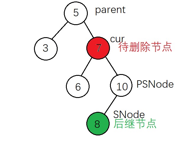 6 if (cur->right == SNode) //后继节点为待删除节点的右子树(后继节点有右子树和没有右子树的操作相同)