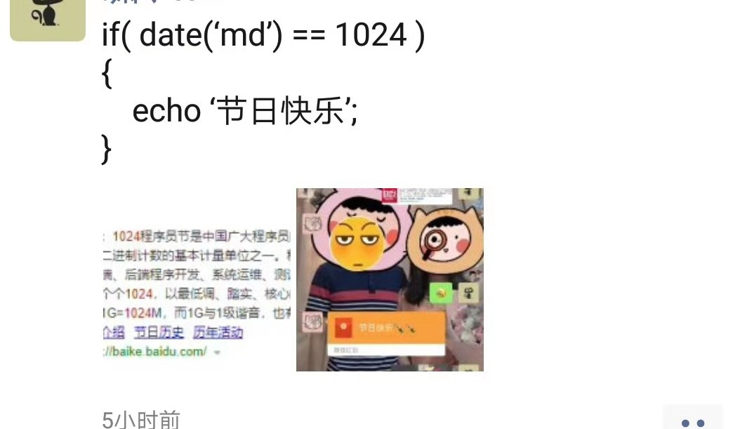 每每到了什么节什么日的日子,都是我们这种单身小动物吃狗粮最密集的日子。今天是十月二十四号,本来不是什么节日的日子,在程序员看来竟然成了程序员节;作为小白的我,也有一些朋友和我是同行的,于是朋友圈自然少不了撒狗粮的,这波狗粮还是专属狗粮,令我连连大饱嗝。