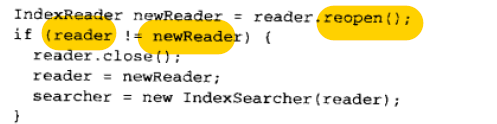public class NearRealTimeTest extends TestCase { public void testNearRealTime() throws Exception { Directory dir = new RAMDirectory(); IndexWriter writer = new IndexWriter(dir, new StandardAnalyzer(Version.LUCENE_30), IndexWriter.MaxFieldLength.UNLIMITED); for(int i=0;i<10;i++) { Document doc = new Document(); doc.add(new Field("id", ""+i, Field.Store.NO, Field.Index.NOT_ANALYZED_NO_NORMS)); doc.add(new Field("text", "aaa", Field.Store.NO, Field.Index.ANALYZED)); writer.addDocument(doc); } // 会将缓存中所有变更,刷新到索引目录,返回一个包含这些变更的新的reader IndexReader reader = writer.getReader(); // #1 创建近实时 reader IndexSearcher searcher = new IndexSearcher(reader); // #A Query query = new TermQuery(new Term("text", "aaa")); TopDocs docs = searcher.search(query, 1); assertEquals(10, docs.totalHits); // #B writer.deleteDocuments(new Term("id", "7")); // #2 Document doc = new Document(); // #3 doc.add(new Field("id", // #3 "11", // #3 Field.Store.NO, // #3 Field.Index.NOT_ANALYZED_NO_NORMS)); // #3 doc.add(new Field("text", // #3 "bbb", // #3 Field.Store.NO, // #3 Field.Index.ANALYZED)); // #3 writer.addDocument(doc); // #3 // reopen 完成更多变更,效率很高: // 只会打开上次open、reopen的文件 // 未发生任何改变的被共享(共享先前的reader) IndexReader newReader = reader.reopen(); // #4 assertFalse(reader == newReader); // #5 reader.close(); // #6 searcher = new IndexSearcher(newReader); TopDocs hits = searcher.search(query, 10); // #7 assertEquals(9, hits.totalHits); // #7 query = new TermQuery(new Term("text", "bbb")); // #8 hits = searcher.search(query, 1); // #8 assertEquals(1, hits.totalHits); // #8 newReader.close(); writer.close(); } } /* #1 Create near-real-time reader #A Wrap reader in IndexSearcher #B Search returns 10 hits #2 Delete 1 document #3 Add 1 document #4 Reopen reader #5 Confirm reader is new #6 Close old reader #7 Verify 9 hits now #8 Confirm new document matched */