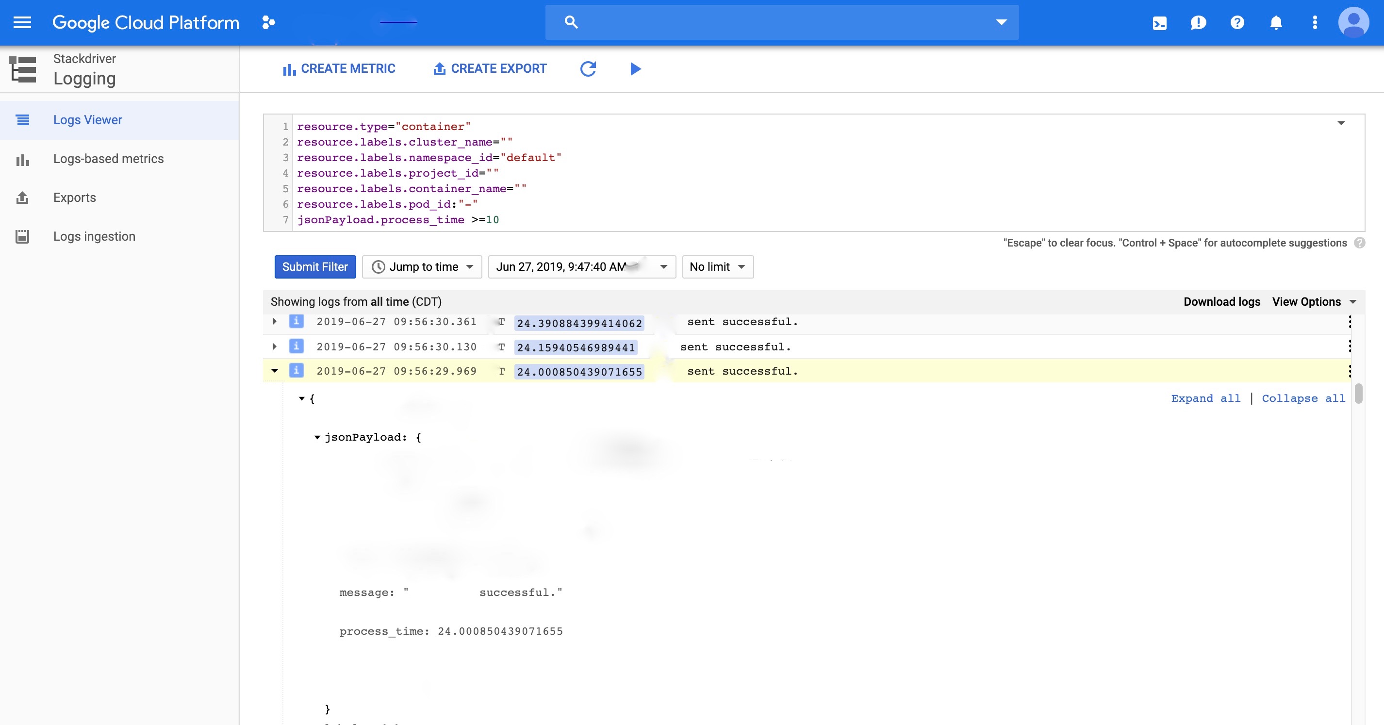 Already created my filters with a specific value from the jsonPayload.