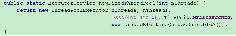 由此可见,该线程池核心线程数和最大线程数均为构造参数值nThreads,线程最大空闲时间为0,任务队列采用LinkedBlockingQueue,默认容量上限是Integer.MAX_VALUE。