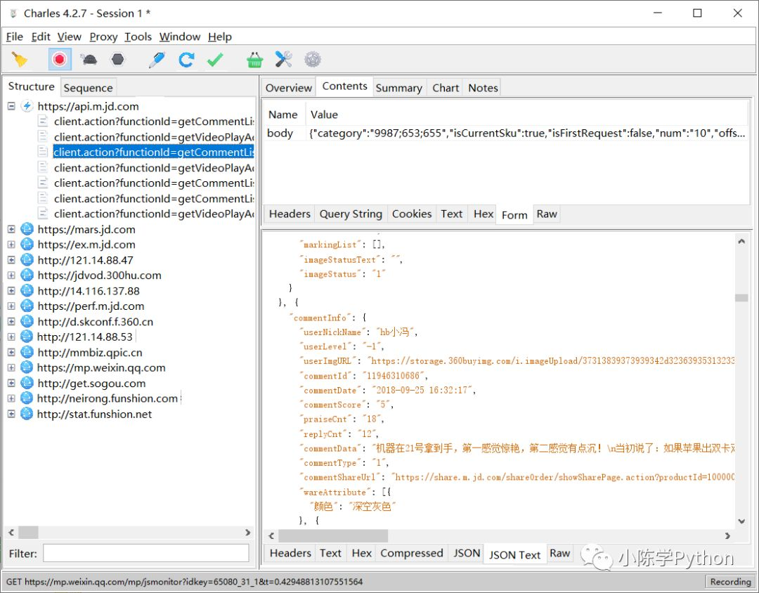 这时打开手机京东,注意一定要提前设置好 Charles 代理并配置好 CA 证书,否则没有效果。打开任意一个商品,然后打开它的商品评论页面,不断上拉加载评论,可以看到 Charles 捕获到这个过程中京东 App 内发生的所有网络请求,如图所示。