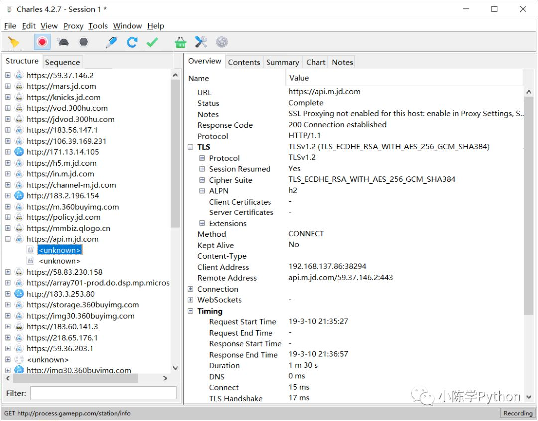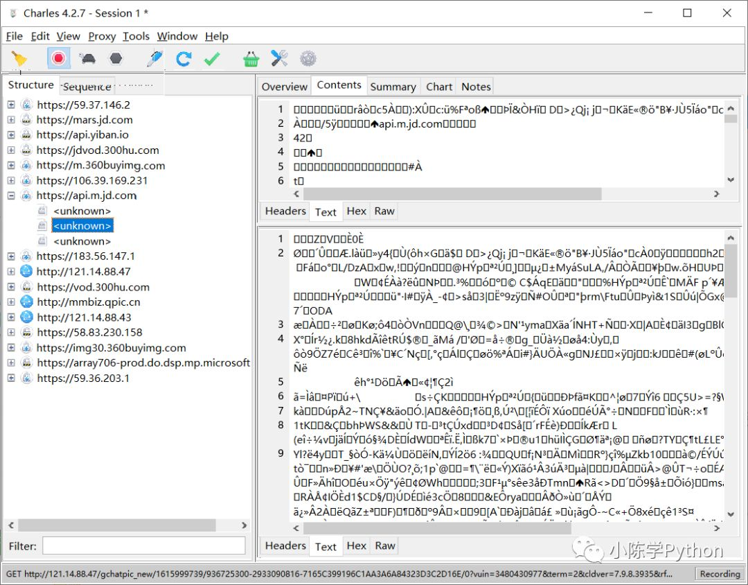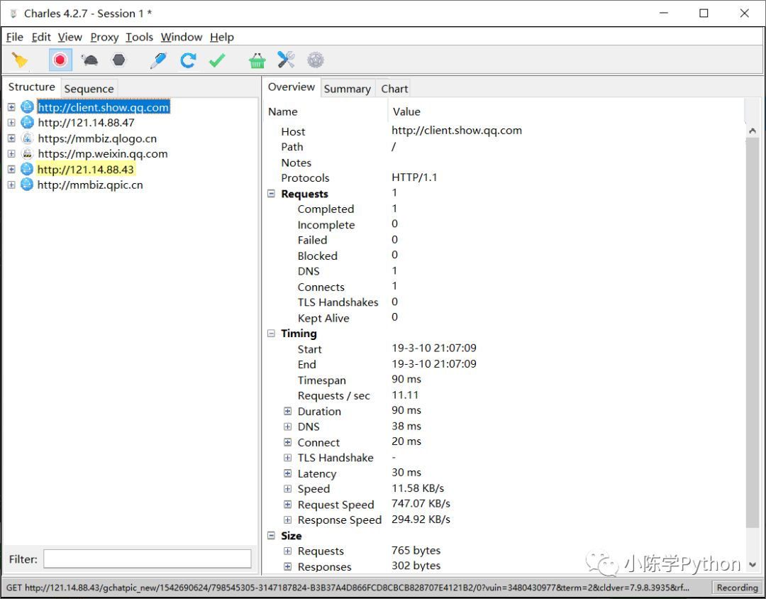Charles 会一直监听 PC 和手机发生的网络数据包,捕获到的数据包就会显示在左侧,随着时间的推移,捕获的数据包越来越多,左侧列表的内容也会越来越多。