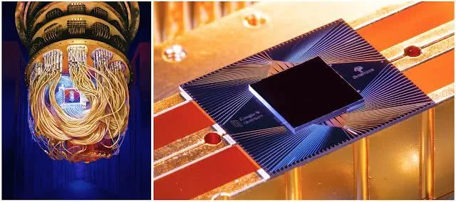 左:Sycamore 量子计算机悬在低温恒温器中的艺术加工图;右:Sycamore 的照片。