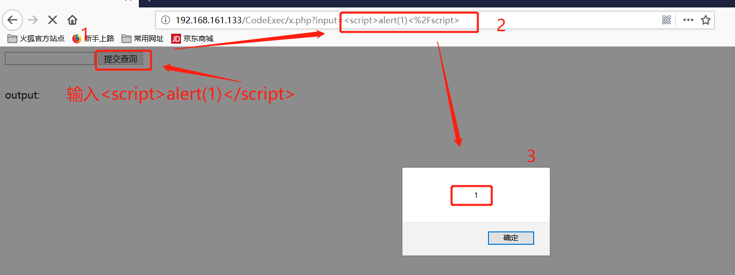 通过代码分析,开始构造我们的payload为:<script>alert(1)</script>时,页面成功弹窗且弹窗内容为填写字符串的值