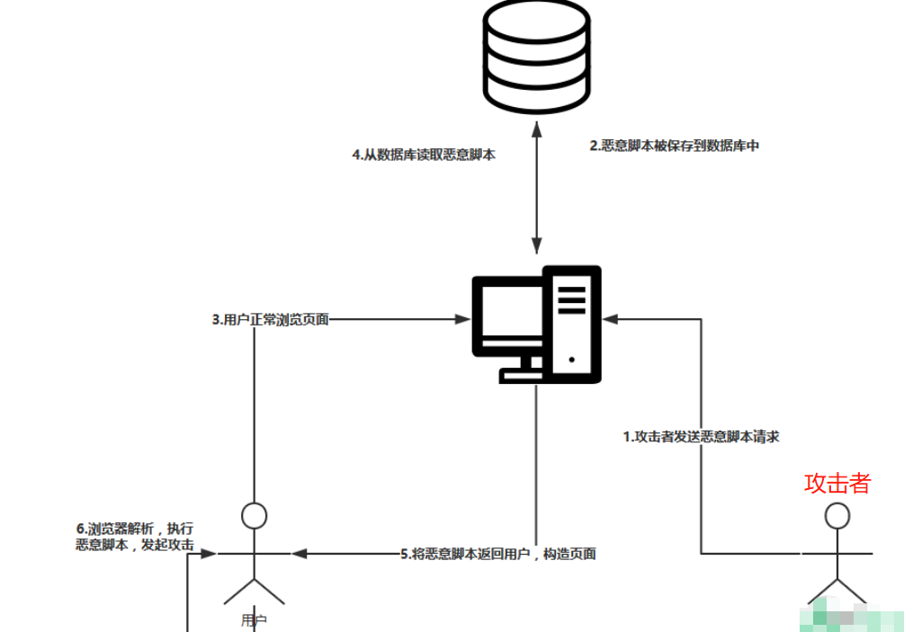 和反射性XSS的即时响应相比,存储型XSS则需要先把利用代码保存在比如数据库或文件中,当web程序读取利用代码时再输出在页面上执行利用代码。但存储型XSS不用考虑绕过浏览器的过滤问题,屏蔽性也要好很多。 存储型XSS攻击流程: