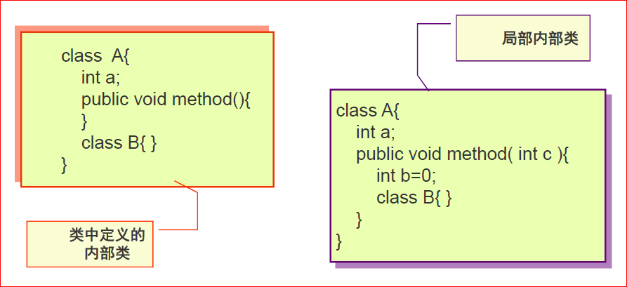 - 非静态内部类只能定义非静态成员,而静态内部类可以定义静态成员和非静态成员
