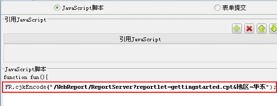 var url = FR.cjkEncode("/WebReport/ReportServer?reportlet=Gettingstarted.cpt&地区=华东");