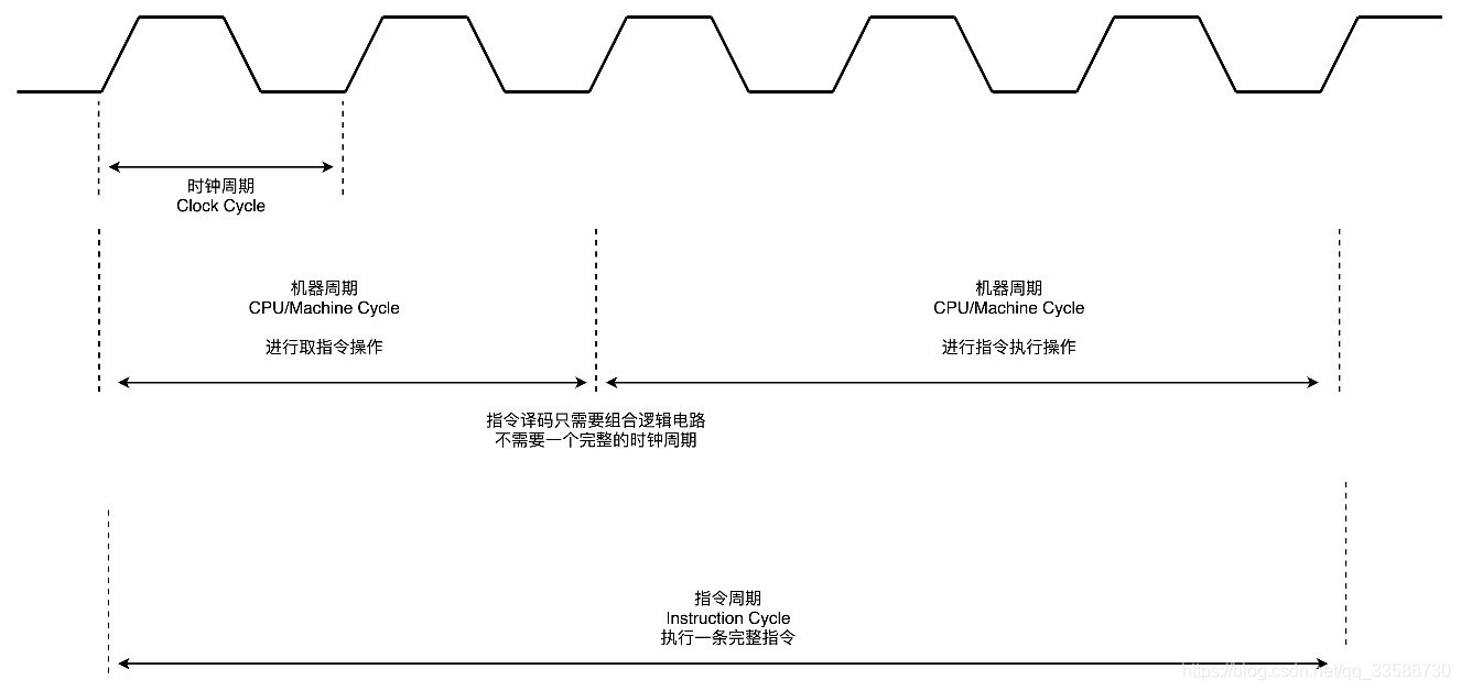 (2)还有一个是Clock Cycle,即时钟周期(对应机器的主频)。一个CPU周期通常会由几个时钟周期累积起来。一个CPU周期的时间,就是几个Clock Cycle的总和。