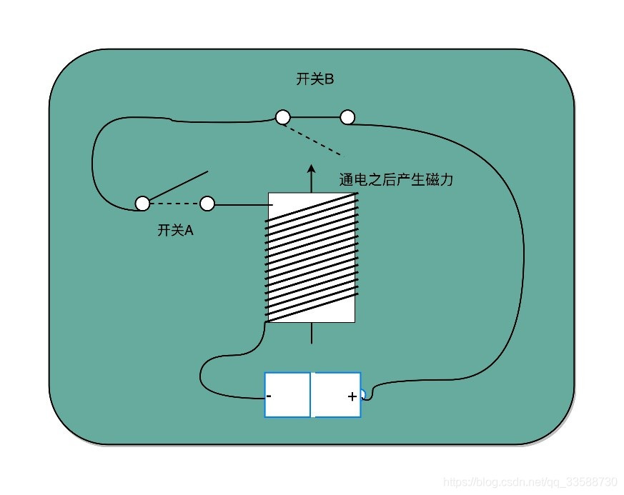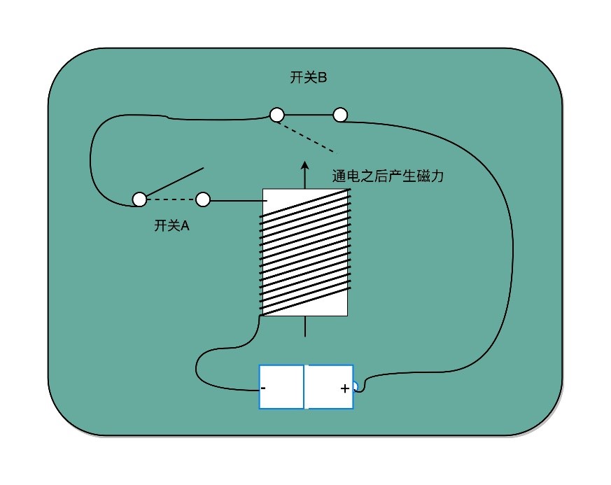 6. 要实现时序逻辑电路,首先要实现一个时钟信号。实际上时钟信号的实现,就像是一个回路接了2个开关,其中一个开关由我们控制,另一个开关由电磁线圈控制,如下所示: